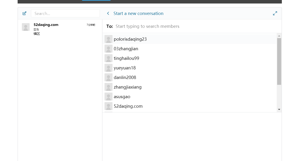 下图展示的是私聊查找功能, 自动下拉菜单会向你展示你可能要联系的一小部分用户的用户名, 如果列表中没有, 也可以输入其用户名搜索查询.